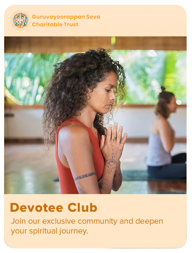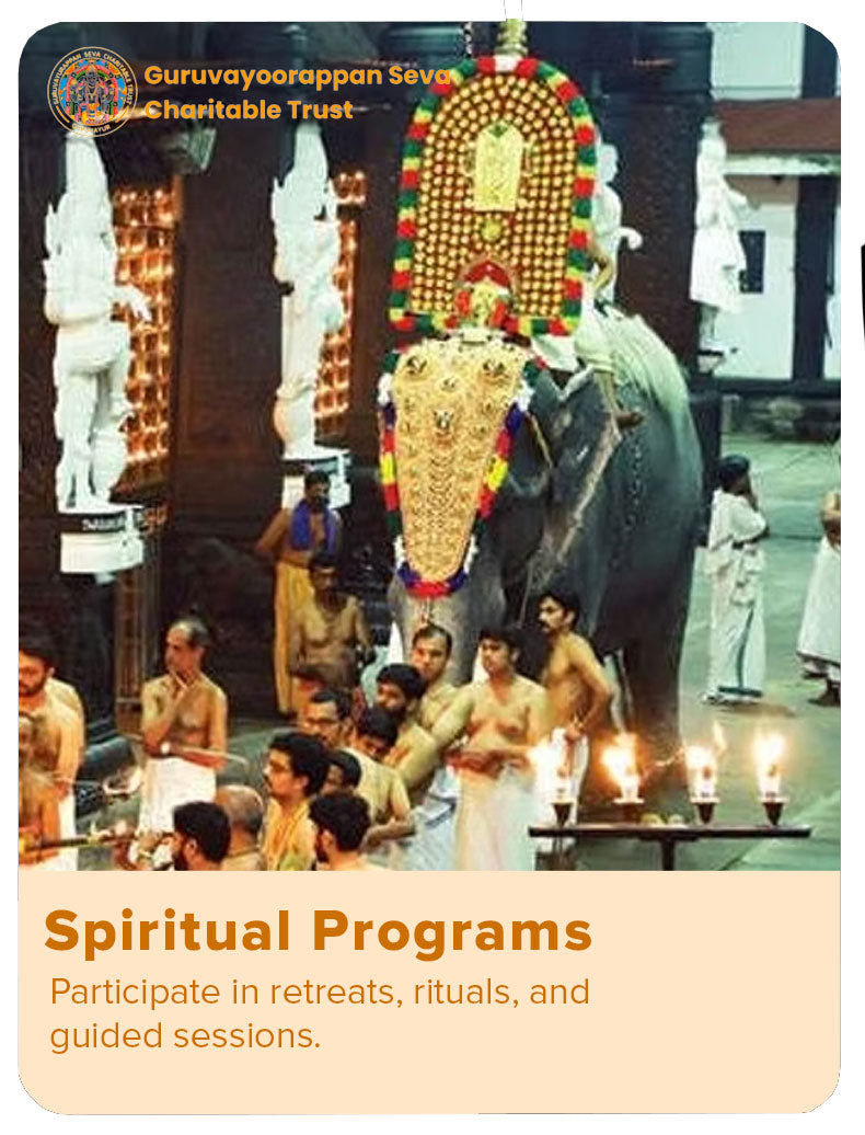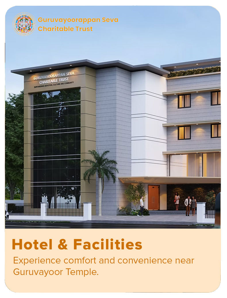 Located near the sacred Guruvayoor Temple, we offer a range of meaningful initiatives—from our Devotee Club and enriching cultural programs to holistic wellness services and premium accommodations—all designed to elevate the spiritual and cultural journey of every devotee.